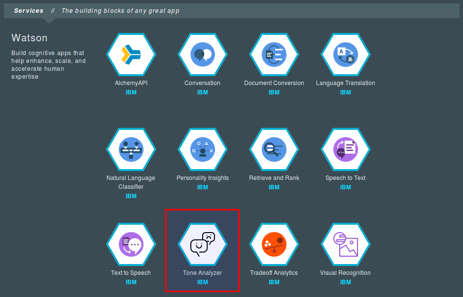 - Inside the "Services" menu, select "Tone Analyzer" to generate the credentials.